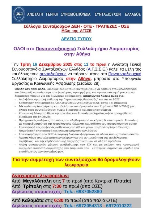 Tην Τρίτη 16 Δεκεμβρίου 2025 στις 11 το πρωί η Ανώτατη Γενική Συνομοσπονδία Συνταξιούχων Ελλάδος (Α.Γ.Σ.Σ.Ε.) καλεί τα μέλη της και όλους τους συνταξιούχους να πάρουν μέρος στο Πανσυνταξιουχικό Συλλαλητήριο Διαμαρτυρίας στην Αθήνα, μπροστά στο Υπουργείο Εργασίας & Κοινωνικής Ασφάλισης (Σταδίου 29).