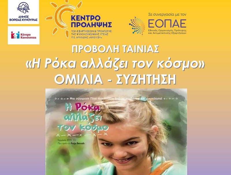 Ο Δήμος Βόρειας Κυνουρίας σε συνεργασία με το Κέντρο Πρόληψης των Εξαρτήσεων και Προαγωγής της Ψυχοκοινωνικής Υγείας Π.Ε. Αρκαδίας «Ανέλιξη», -σε συνεργασία με τον Εθνικό Οργανισμό Πρόληψης & Αντιμετώπισης των Εξαρτήσεων (Ε.Ο.Π.Α.Ε.)- και το Κέντρο Κοινότητας του Δήμου, διοργανώνει εκδήλωση αφιερωμένη στην Πρόληψη με την προβολή ταινίας με τίτλο: «Η Ρόκα αλλάζει τον κόσμο».