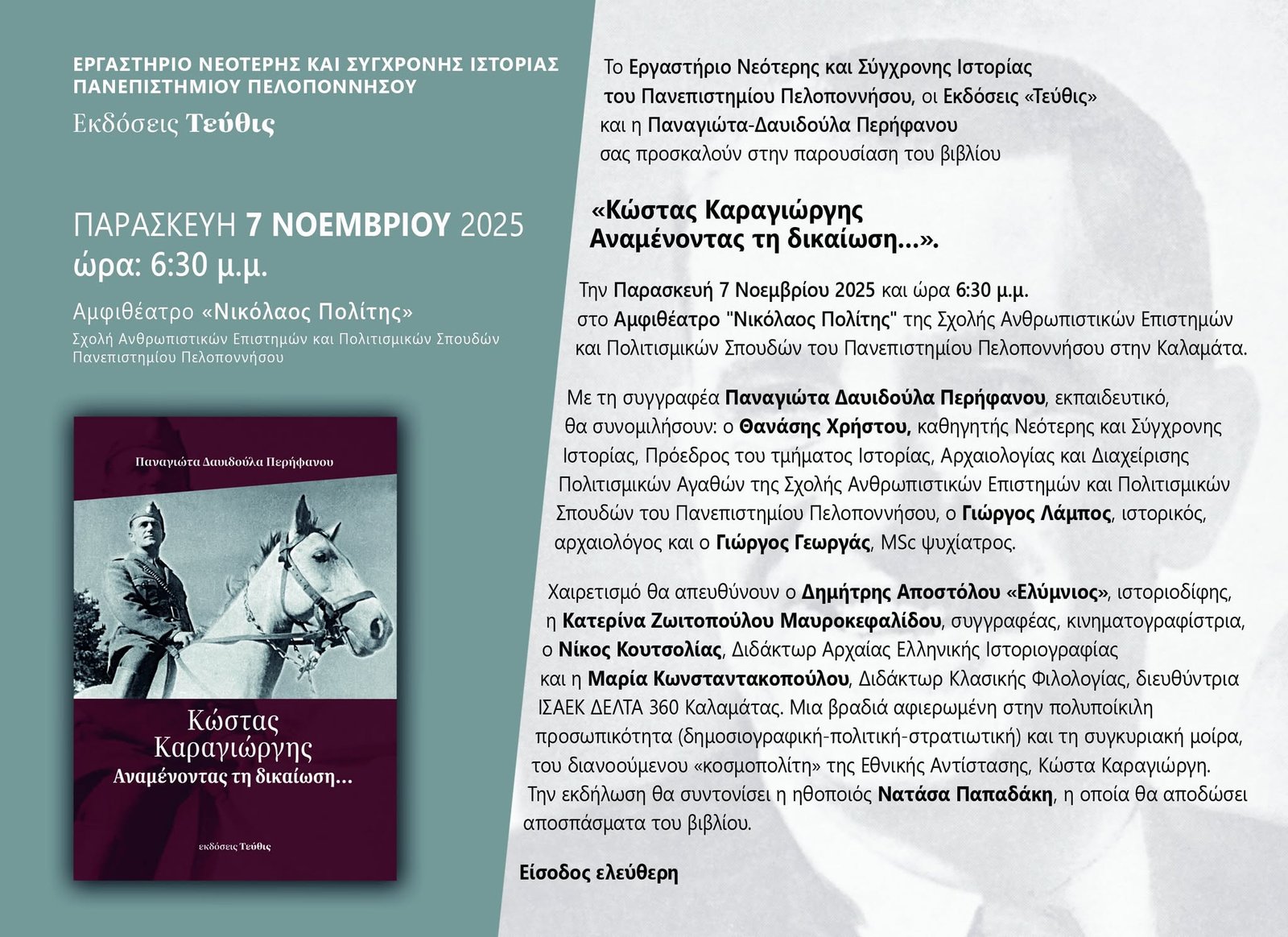 Την Παρασκευή 7 Νοεμβρίου 2025, στις 6:30 μ.μ. θα πραγματοποιηθεί στο Αμφιθέατρο «Νικόλαος Πολίτης» του Πανεπιστημίου Πελοποννήσου στην Καλαμάτα (πλησίον Παλαιού Στρατοπέδου) η παρουσίαση του βιβλίου της Παναγιώτας Δαυιδούλας Περήφανου «Κώστας Καραγιώργης. Αναμένοντας τη δικαίωση…» από το Εργαστήριο Νεότερης και Σύγχρονης Ιστορίας του Πανεπιστημίου Πελοποννήσου και τις Εκδόσεις ΤΕΥΘΙΣ.