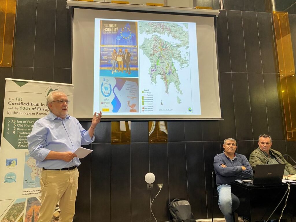 Ο Πρόεδρος της Ένωσης Φορέων Κ.Αλ.Ο. Πελοποννήσου «Πέλοπας» κ. Ιωάννης Λαγός κατά την τοποθέτησή του αναφέρθηκε στην επιτυχία του μοντέλου του Menalon Trail για τη βιωσιμότητα του επιχειρηματικού, οικονομικού, κοινωνικού, περιβαλλοντικού και πολιτισμικού περιβάλλοντος της Γορτυνίας, το οποίο οδήγησε και στη σημαντική βράβευση του Peloponnese Trails στα European Social Economy Awards 2025. Αναφέρθηκε επίσης στην επέκταση του δικτύου των μονοπατιών με άξονες αναφοράς το Pan Trail και το Arcadia Trail.