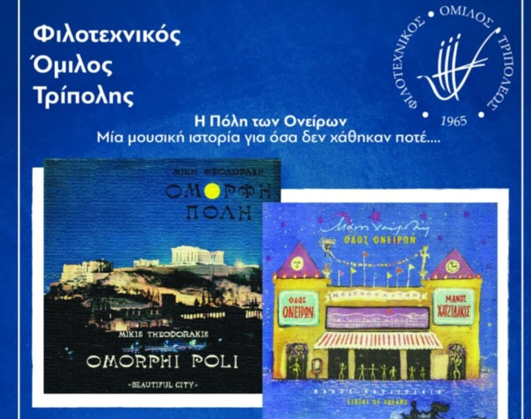 Ο Φιλοτεχνικός Όμιλος Τρίπολης διοργανώνει την Παρασκευή, 28 Νοεμβρίου 2025, στις 9 μ.μ. στο Μουσικό Σχολείο Τρίπολης, μουσικο-λογοτεχνική βραδιά με θέμα: “Η πόλη των ονείρων”