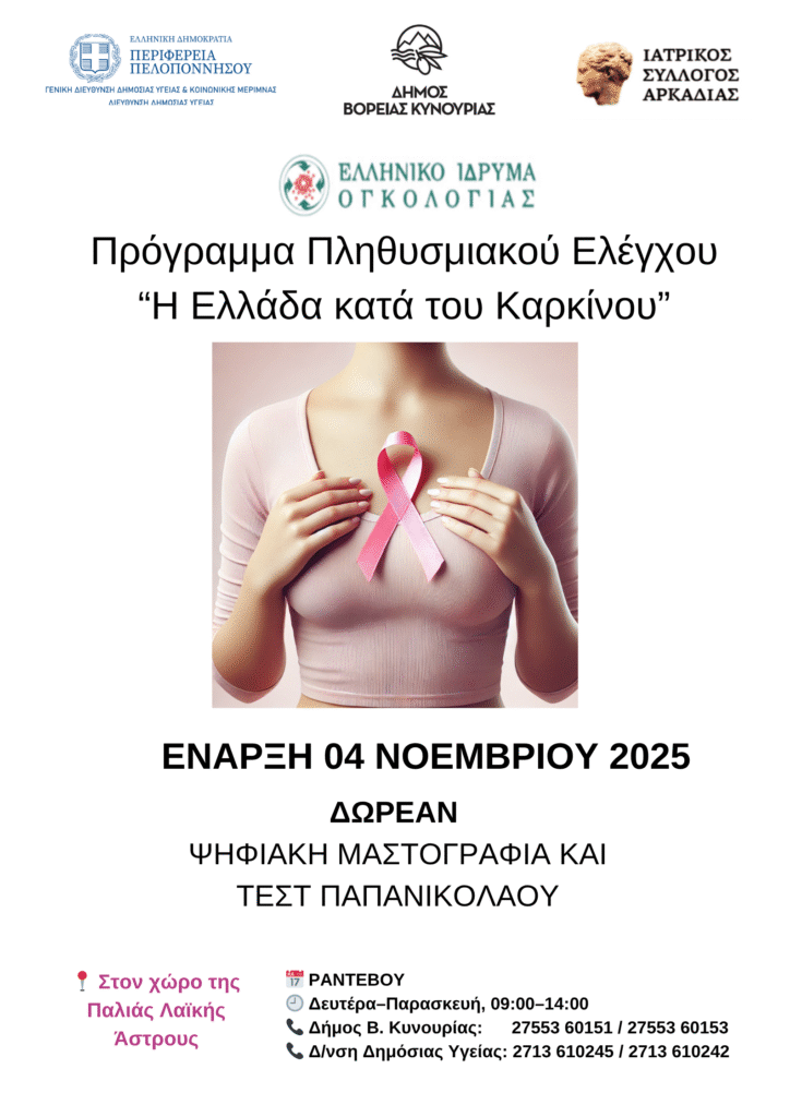 Στο πλαίσιο του προγράμματος πληθυσμιακού ελέγχου «Η ΕΛΛΑΔΑ ΚΑΤΑ ΤΟΥ ΚΑΡΚΙΝΟΥ», που πραγματοποιεί το Ελληνικό Ίδρυμα Ογκολογίας σε συνεργασία με την Περιφέρεια Πελοποννήσου για την πρόληψη και την έγκαιρη διάγνωση του καρκίνου του μαστού και του τραχήλου της μήτρας, ξεκινά την Τρίτη 04/11/2025 πρόγραμμα πληθυσμιακού ελέγχου για τις γυναίκες που κατοικούν στον Δήμο Βόρειας Κυνουρίας με εξέταση Ψηφιακής Μαστογραφίας και Τεστ Παπανικολάου.