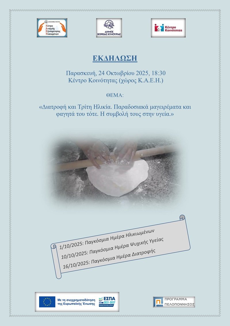 Ο Δήμος Βόρειας Κυνουρίας με αφορμή τις Παγκόσμιες Ημέρες Ηλικιωμένων (1/10), Ψυχικής Υγείας (10/10) και Διατροφής (16/10), σε συνεργασία με το Κέντρο Κοινότητας και το Κ.Α.Ε.Η. διοργανώνει εκδήλωση με θέμα: «Διατροφή και Τρίτη Ηλικία. Παραδοσιακά μαγειρέματα και φαγητά του τότε. Η συμβολή τους στην υγεία.»